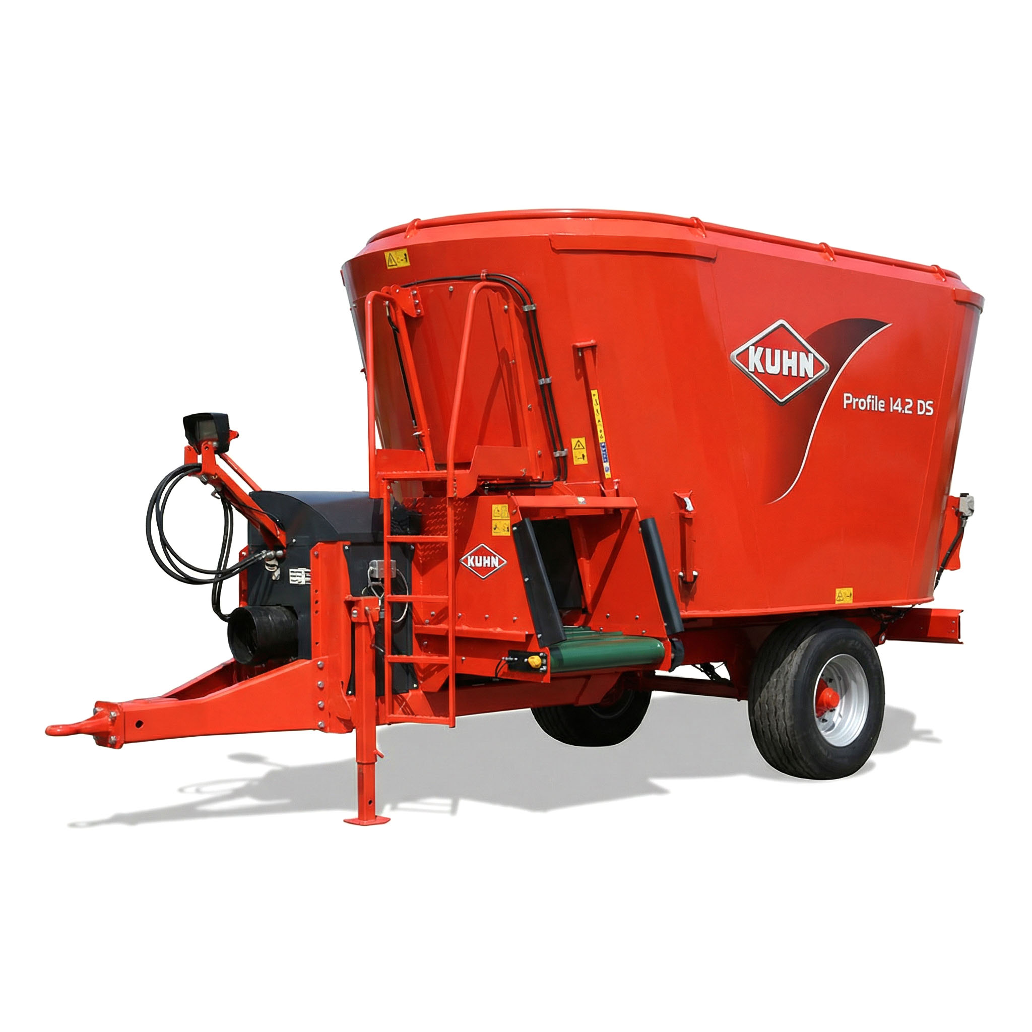 KUHN Profile 14.2 DS – надежный прицепной кормосмеситель с объемом 14 м³, двумя вертикальными шнеками и поперечным конвейером. Он способен накормить стадо от 70 голов и демонстрирует лучшие результаты по однородности смешивания, точности взвешивания и энергопотреблению, подтвержденные полевыми тестами DLG (немецкое общество сельского хозяйства).